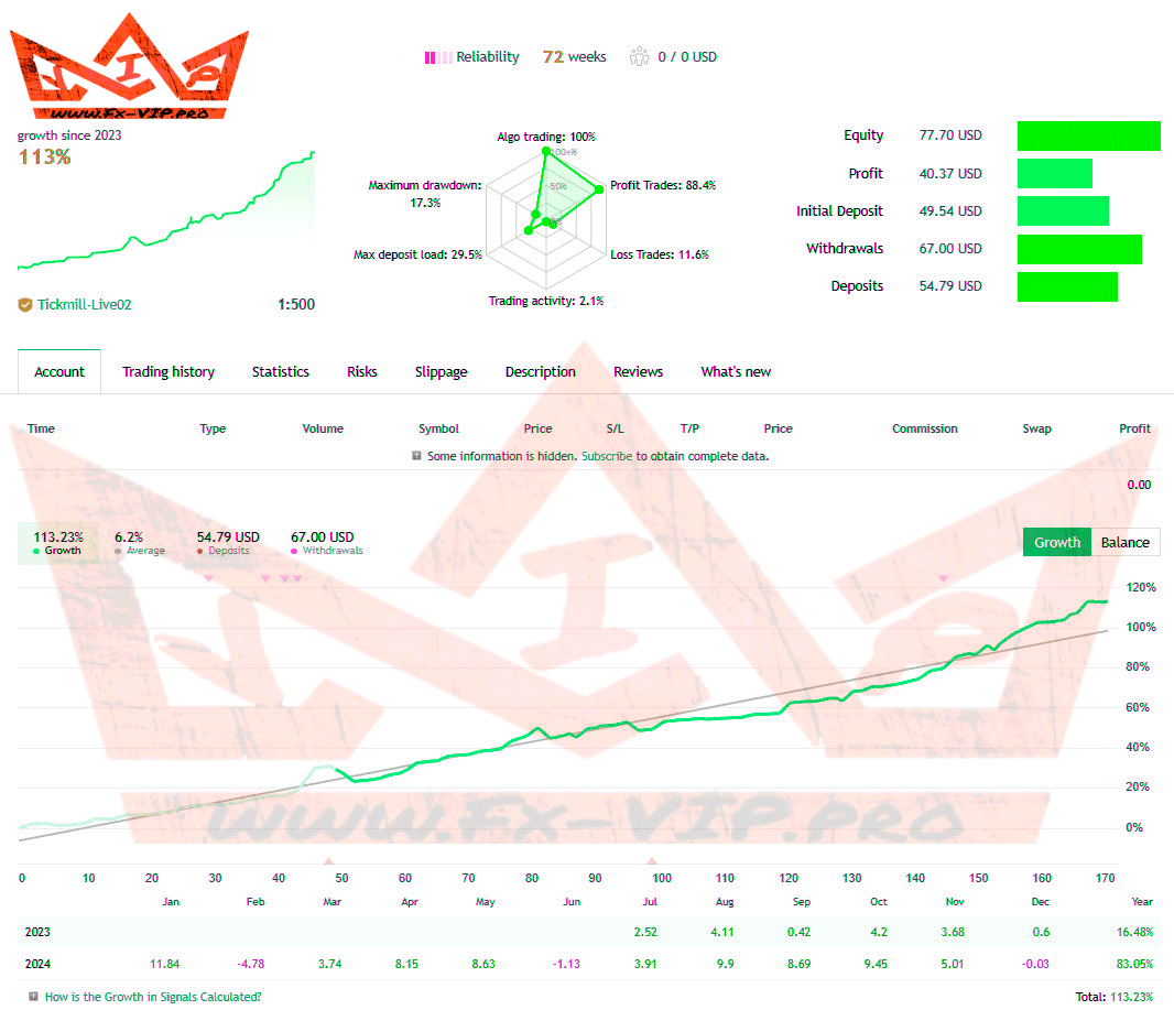 EA trading monitoring looks convincing, it has been trading for over a year and brings profit from month to month, during the entire trading period there were only a few unprofitable months, and so in general the advisor has already earned 113% profit at the time of writing this post, the drawdown is relatively small, which should also be noted that the advisor is used on a small deposit of only $ 50.