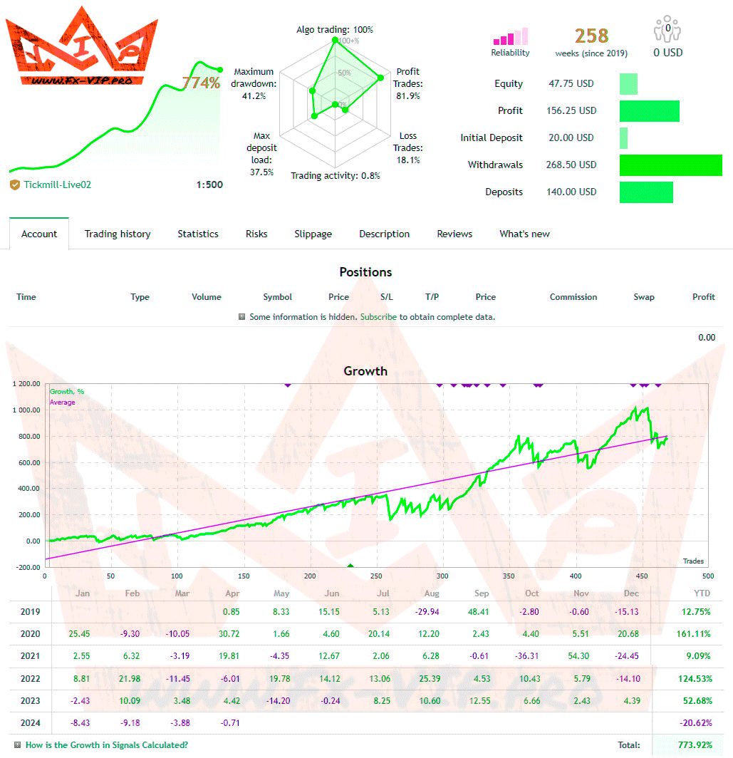Backtesting was not carried out as there are account signal from the author, detailed statistics of trade can be found below