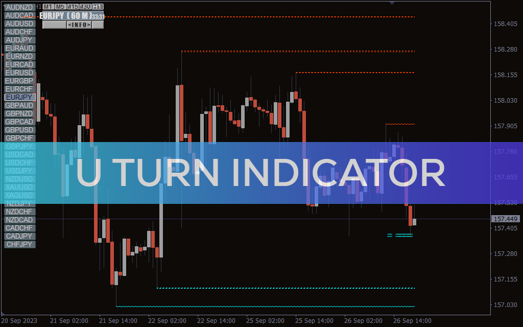 U Turn Indicator For MT4 scans the history and plots potential price reversal points, provides buy and sell forex trading signals with good risk reward