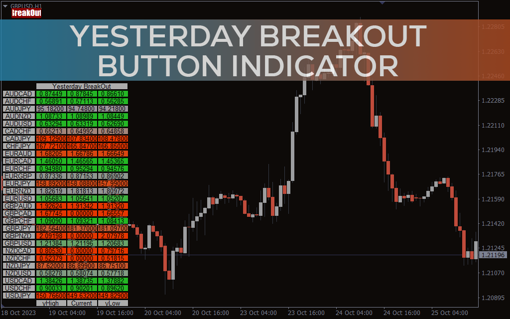 Yesterday Breakout Button Indicator For MT4 indicator plots a table of multiple forex currency pairs with a high low of yesterday and the current price