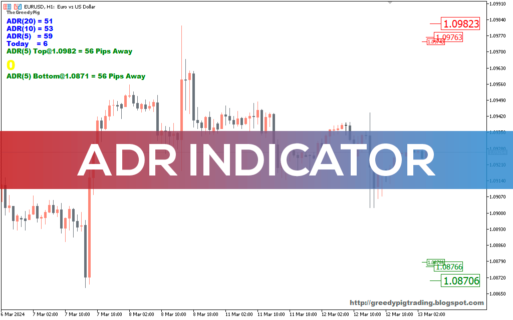 ADR indicator great tool for enhancing your trade exit strategy. Shows the price range within a specified period and projected top and bottom points of the price.