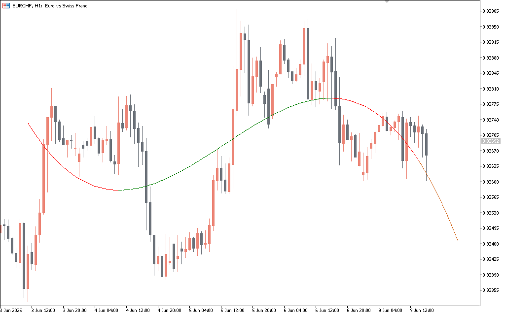 Instead of issuing traditional buy/sell signals, the Polynomial Regression Extrapolation Indicator displays a colored curved line that adapts to recent price behavior and extends forward as a projected path. When the curve shifts direction or changes color—from green (bullish) to red (bearish)—it suggests a potential turning point in trend momentum. Traders often use the curvature’s inflection points and projected end to anticipate future resistance or support. If the price is diverging from the projected path, it can signal exhaustion or a setup for a reversal. Meanwhile, price following the curve suggests a continuation phase. This visual dynamic allows for anticipatory entries and exits rather than reactive trades.