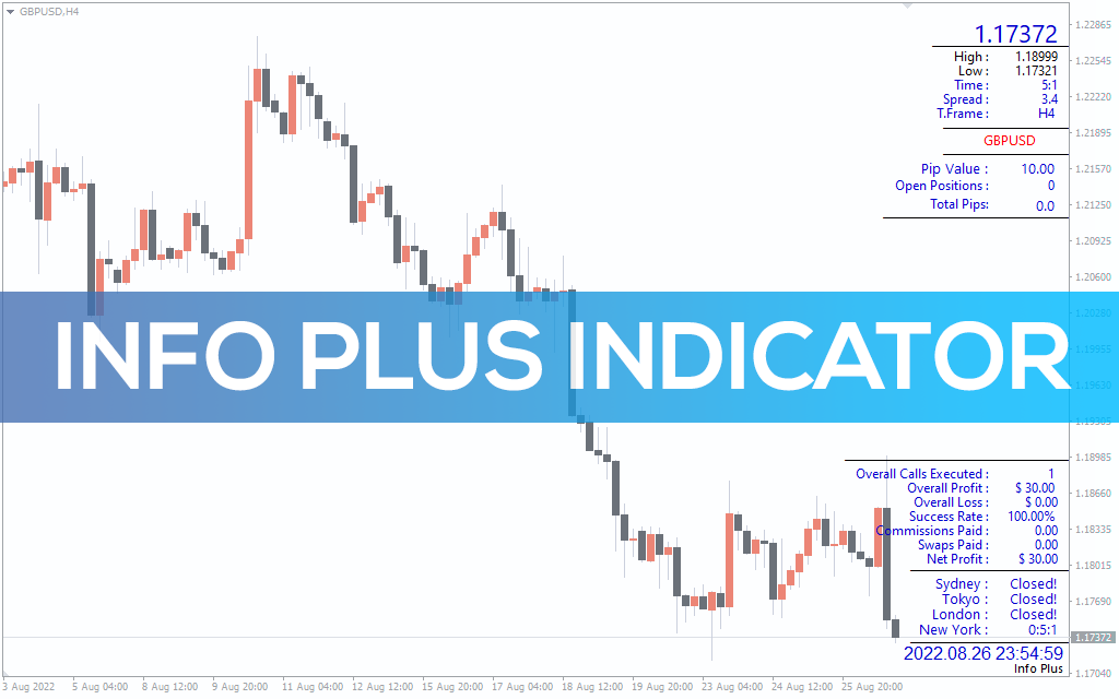 Info Plus is a unique indicator that shows trade position values and information. It is an ideal tool for managing the progress of the position.