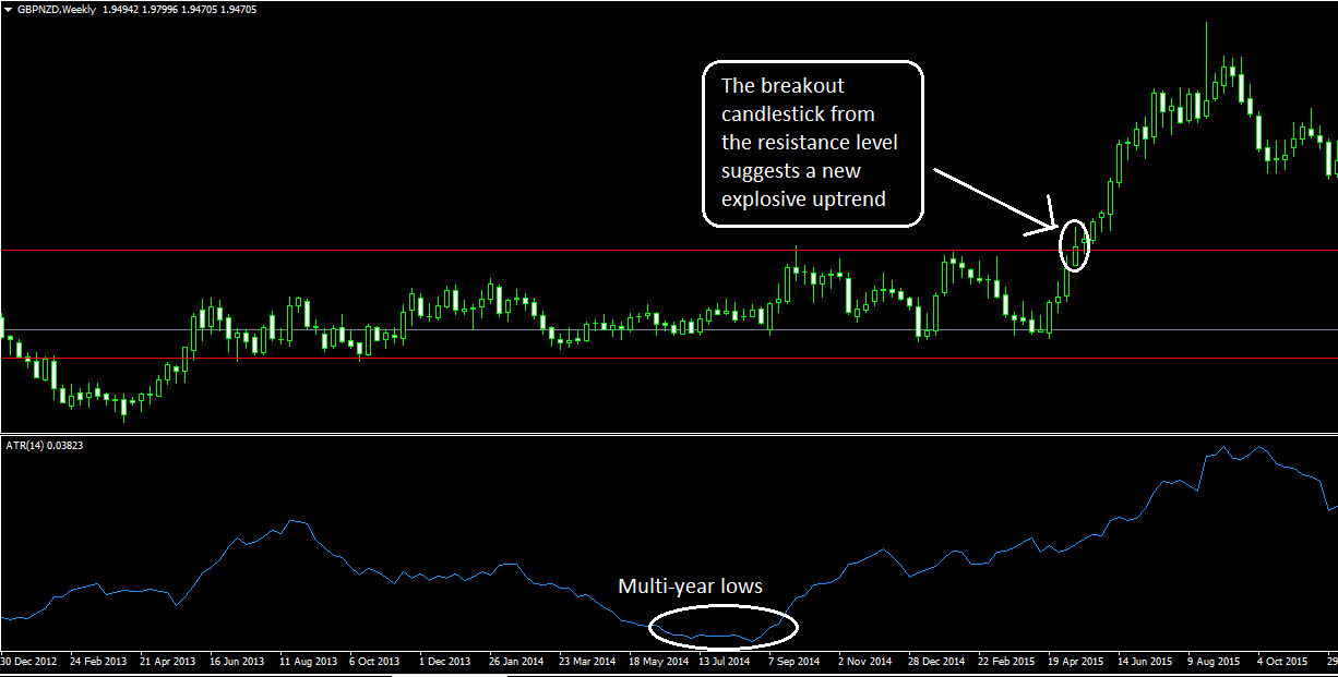 First, you pull up your ATR indicator on the weekly chart and wait for the indicator to hit multi-year lows. In other words, you wait till the market is at its least volatile and the ATR line is closest to the floor. Then you locate the support and resistance levels within this period on your charts and wait for a breakout to occur.