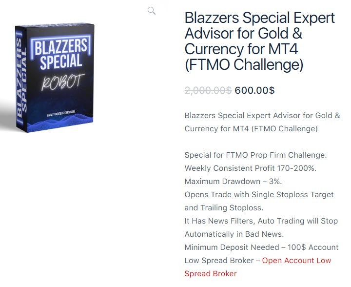 At the moment, we are jointly purchasing another robot from this developer, a robot for passing ftmo, right now you can buy it through us for only $ 11. For this, write here https://t.me/NataDef or here https://t.me/VIPA_bot , after a while the robot will also be available on our store channel https://t.me/EA_List but it will cost a little more but much cheaper than it is sold on the official website. You can learn more about the advisor at the official link, it is sold https://tradeblazzers.com/product/blazzers-special-expert-advisor-for-gold-currency-for-mt4-ftmo-challenge/