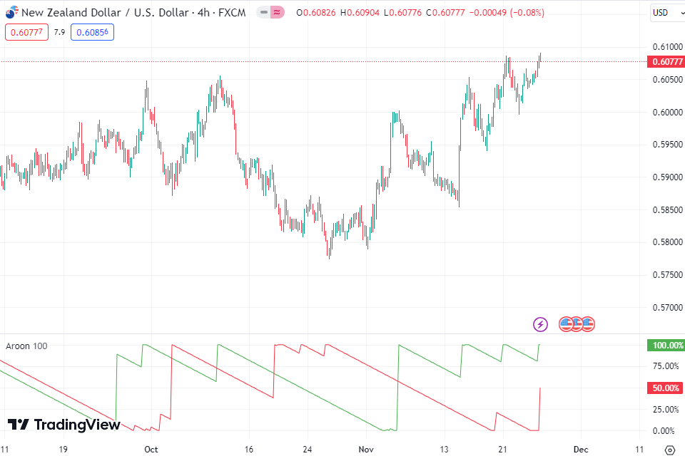 Use Case: In a bullish scenario, the Aroon Oscillator can provide valuable insights. When the Aroon Up (green line) is consistently higher than the Aroon Down (red line), it indicates a strong upward trend. Traders can look for potential entry points during pullbacks or consolidations, aligning their trades with the prevailing bullish momentum. Conversely, in a bearish trend, when the Aroon Down is dominant, traders may consider short positions or tightening their stop-loss levels during brief upward movements.