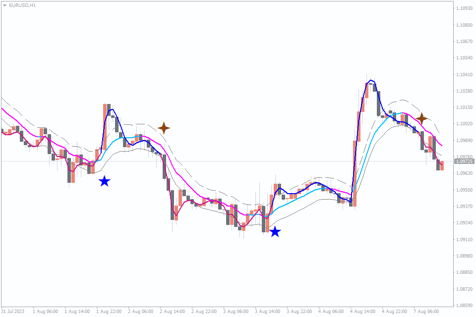 Traders consider a bullish trend when the price stays above the midline and upper line, and the Jurik Moving Average changes from Magenta to Blue. For a SELL signal, the price should be below the midline and lower line, and the Jurik Moving Average should change color accordingly. Traders book profits on the opposite signal and use stop-loss orders to manage risk.