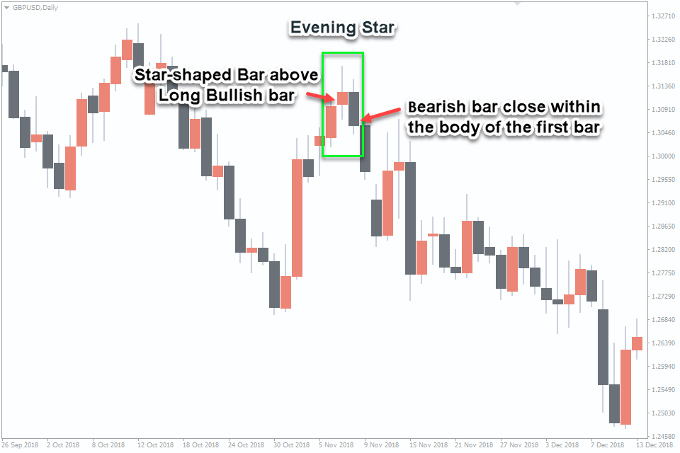 On the other hand, an Evening Star unfolds as follows (in sequence): A long bullish candlestick.