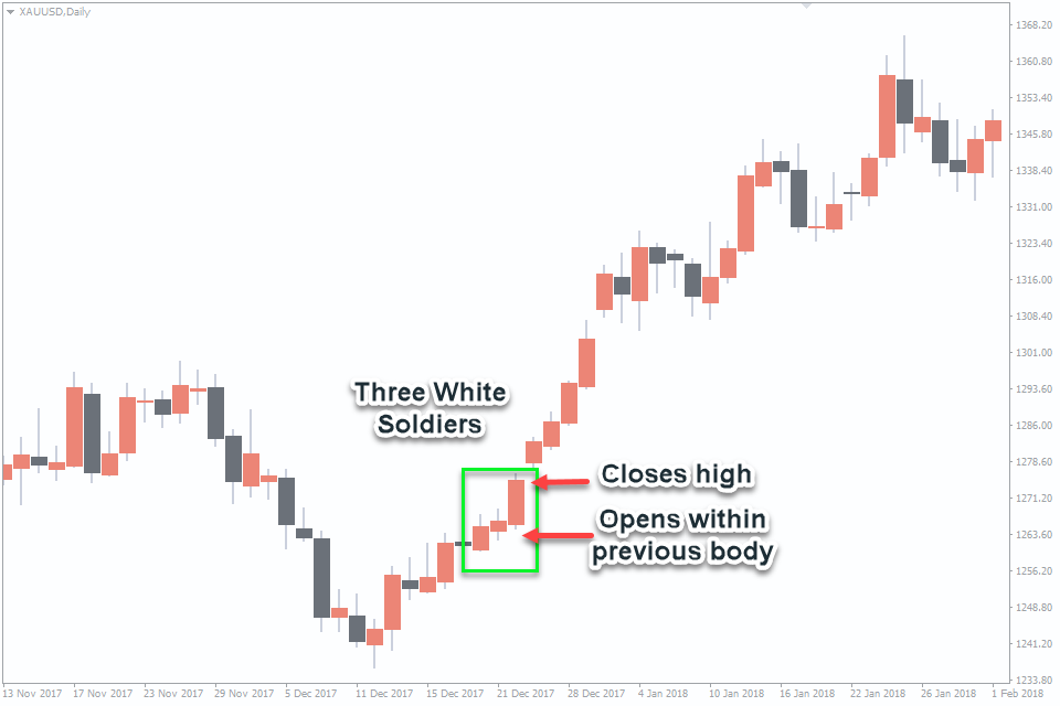 Trading Three White Soldiers: Identify a downtrend. Wait for the appearance of the Three White Soldiers pattern, signaling a potential reversal. Consider entering a long (buy) position at the open of the next candle after the pattern. Place a stop-loss order below the lowest point of the pattern for risk management.