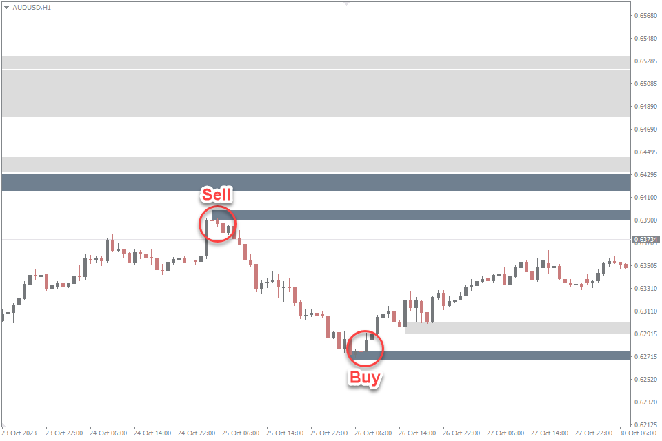 Entry Point for Buy: Look for price to approach a demand zone. When price reaches a demand zone and shows signs of bouncing higher, consider it a potential buy signal. Confirm this with bullish candlestick patterns.