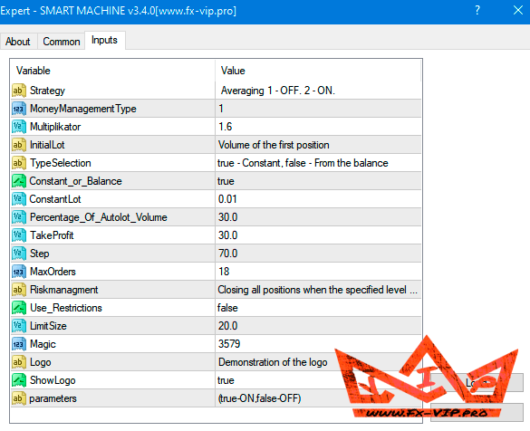 EA SMART MACHINE trades only from levels. He opens the first trade when he receives a signal using VSA analysis. If the first trading position closes positively, then the robot opens a new deal. If the quotes went in the opposite direction from the open position, then the robot turns on its profit exit algorithm, adding new transactions to the market, the size of which increases by the averaging or Martingale method (at the discretion of the investor)