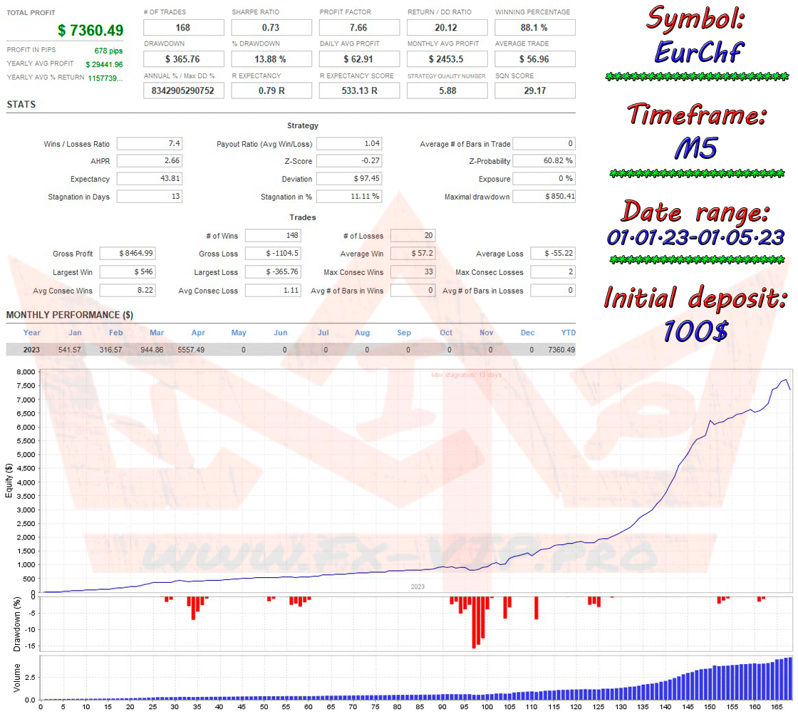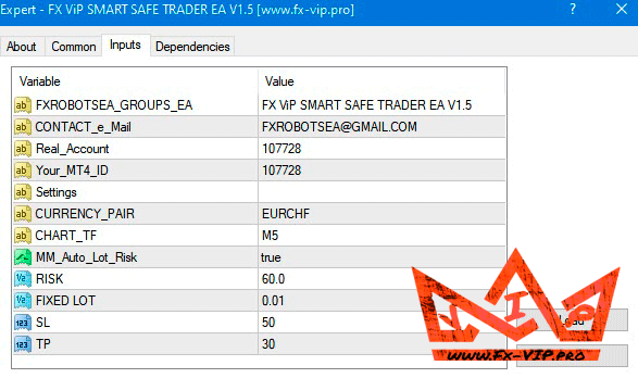 Hello everyone, if you are already tired of making money on EURUSD, GBPUSD, XAUUSD, etc.) and you are eager to make a profit from some new instrument, today I will introduce you to FX ViP SMART SAFE TRADER EA which is designed for trading on a currency pair EURCHF he does not use dangerous trading methods, he enters only one transaction and uses TP and SL.