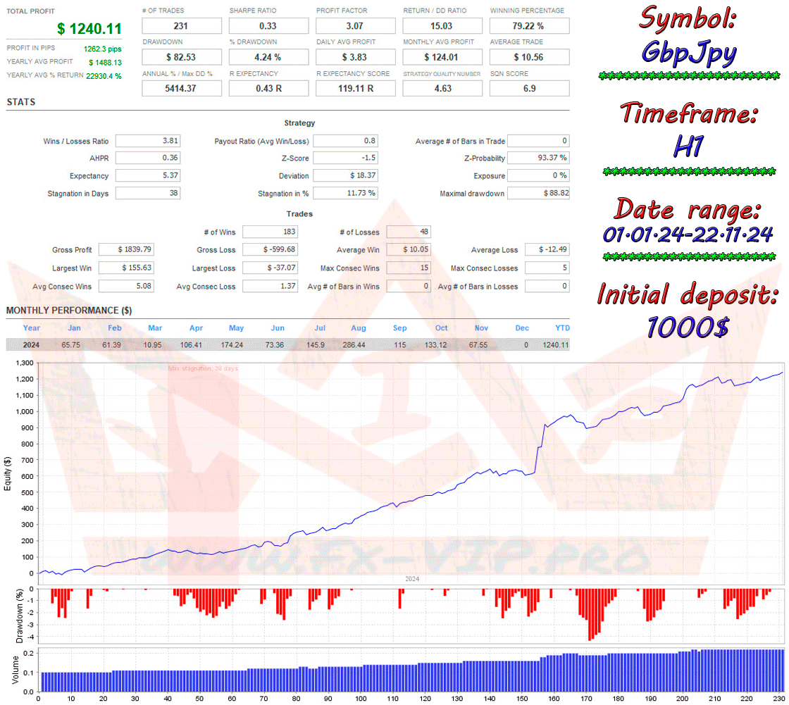 Backtesting was carried out on the GBPJPY currency pair, since the author of the advisor claims that it shows the best results on this pair, the EA settings were installed from the corresponding set file, which is in the archive with EA. Below you can see the test results in more detail.