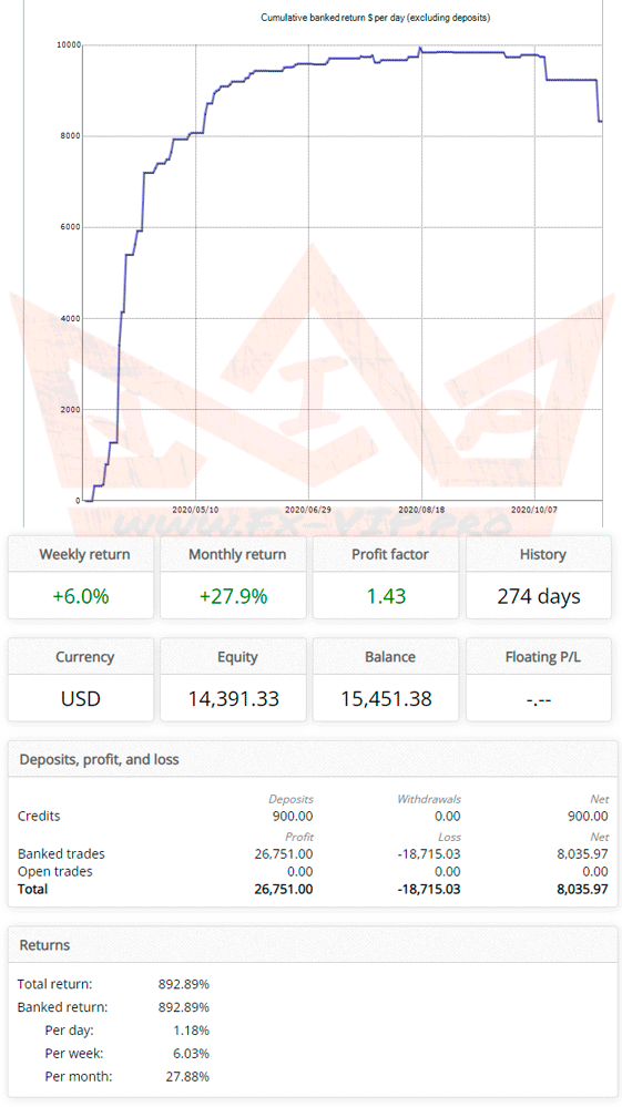 The developer of the adviser also has statistics on working from a real account, which shows a good increase in the deposit, but for some reason trading was carried out in 2020, and after that it was suspended, you can study the monitoring in more detail below
