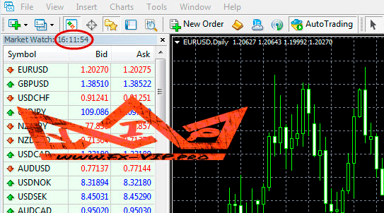 1. We look at the clock in Metatrader (top left in the “Market Watch” window)