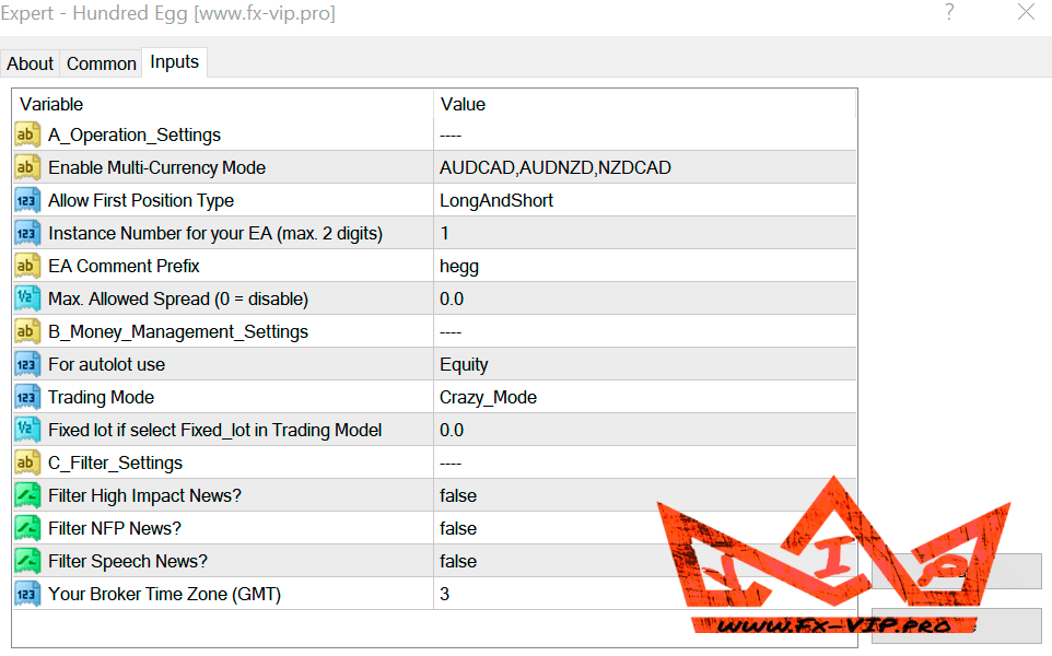 | Enable Multi-Currency Mode | AUDCAD*1,AUDNZD*1,NZDCAD*1 Leave it empty if you attached EA to each single chart. |