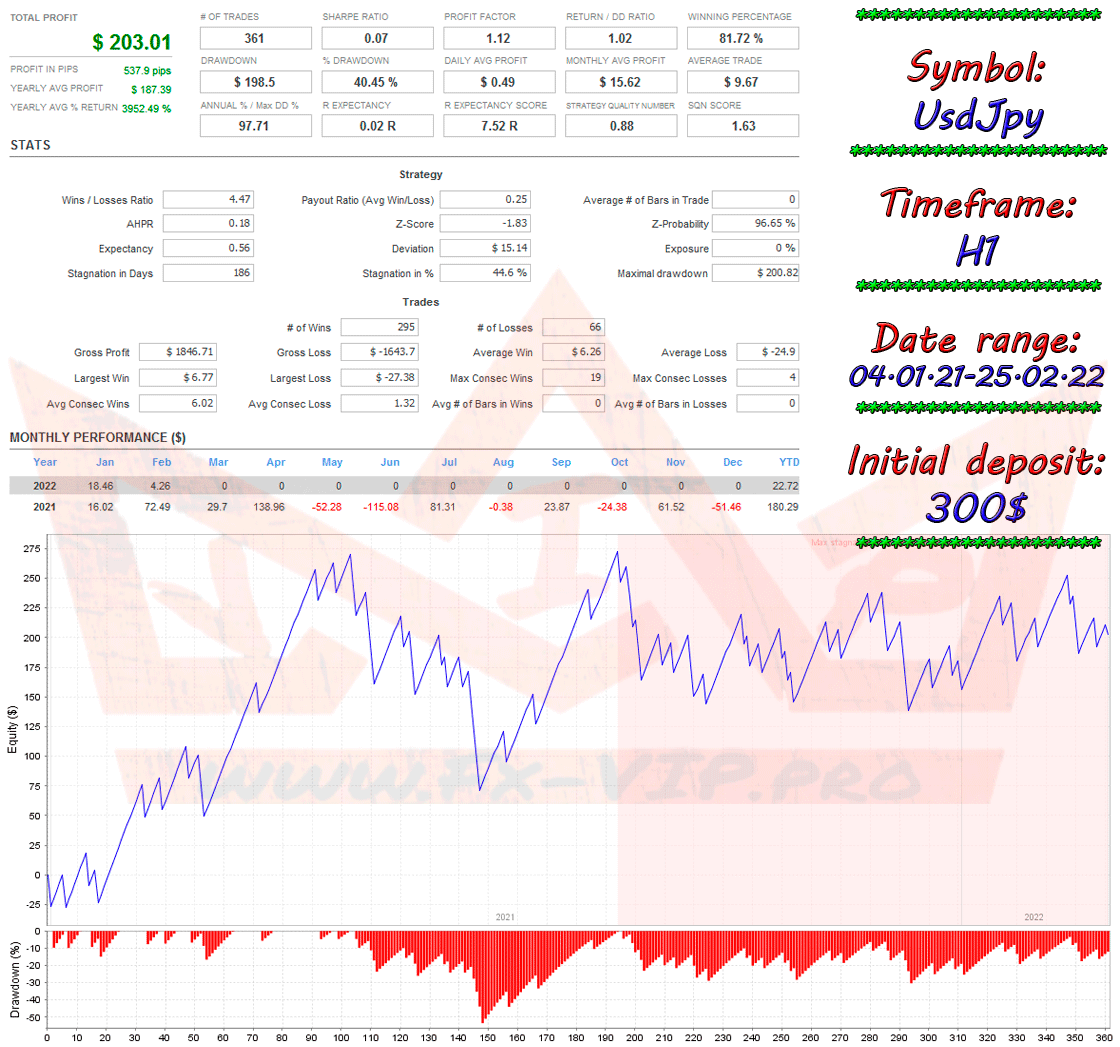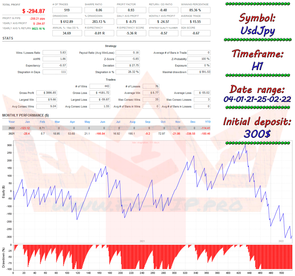 Below you can see the tests of the adviser on the timeframe H1 with an aggressive set, but I decided to do the test in an even more aggressive way, so I tested the adviser on a minimum account of 300 USD on which trading should only go 0.01 lot and no more, but I decided to test with lot 0.05, overestimated the allowable lot by 5 times!!!