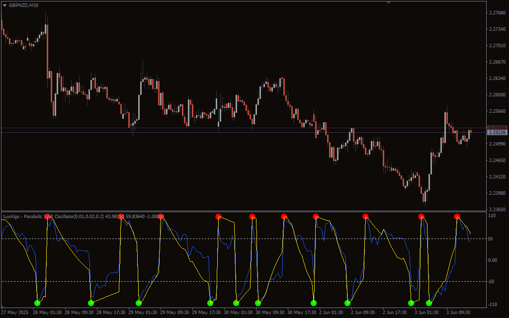 The indicator produces actionable signals by identifying sharp turns within its oscillating curve. Green circles at the bottom of the oscillator line suggest oversold conditions and potential upward reversals, while red circles at the top mark overbought zones and potential trend exhaustion. When the oscillator sharply rises from the lower boundary, traders often interpret it as bullish momentum building. Likewise, a steep descent from the upper region may imply an emerging bearish shift. These signals are even more powerful when confirmed with price structure or volume-based indicators. The smoothness of the oscillator allows for early detection of exhaustion before traditional SAR dots flip, giving proactive traders a valuable edge.