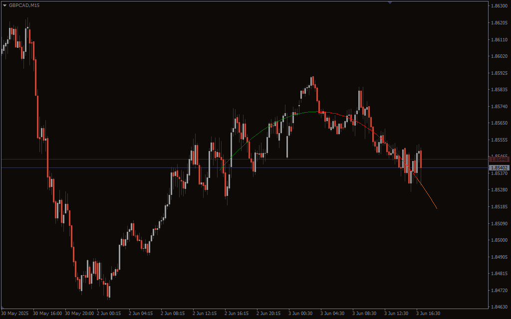 This indicator provides trade signals through its curved path and forecast projection. The regression line changes color based on direction—green during uptrends, red for downtrends—and ends with an extrapolated extension in chocolate color. When the curve transitions from green to red, it suggests fading bullish momentum and the possibility of reversal. Likewise, a shift from red to green can indicate early signs of bullish recovery. The forward extrapolation projects where price may head next based on recent curve behavior, allowing proactive positioning. These signals are particularly useful for intraday traders or those relying on predictive visual cues to time entries and exits with higher accuracy.