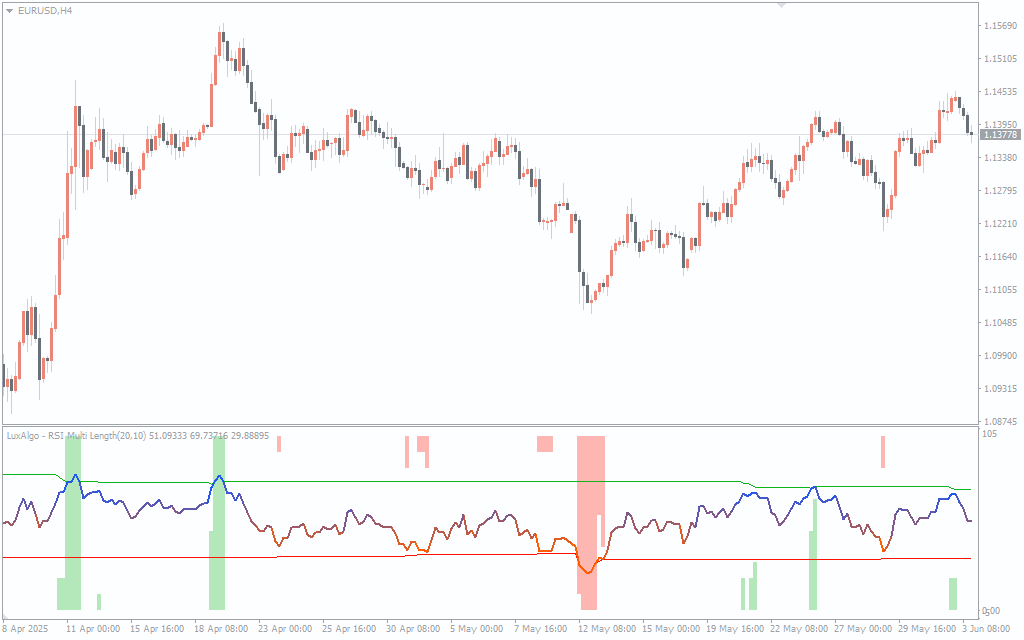 The indicator’s primary signals come from its adaptive RSI curve, which shifts color based on bullish or bearish pressure. When the line crosses above the upper level (typically 70), a green highlight suggests potential overbought territory. Conversely, a move below the lower level (typically 30) triggers a red zone, pointing to possible oversold conditions. What sets this tool apart is its dual RSI tracking across maximum and minimum lengths, which allows the indicator to adapt to both trending and ranging markets. Green or red histogram bars beneath the RSI show strength of confirmation, giving visual weight to each signal. When the RSI sustains movement above or below the thresholds, it often aligns with trend continuation or reversal setups.
