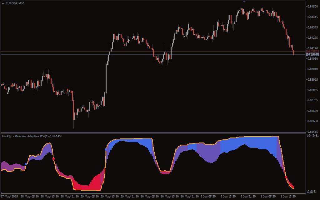 This indicator delivers signals through both shape and color intensity. As the RSI curve accelerates upward, it turns royal blue, indicating strong bullish momentum. When it starts to descend, the color shifts to crimson, signaling bearish conditions. The appearance of round colored dots at the curve’s peaks and troughs further confirms potential overbought or oversold states. These turning points often align with local tops and bottoms on the price chart. The adaptive nature of the RSI ensures that it reacts smoothly during ranging markets and becomes more responsive in trending conditions, reducing false signals. The visual fill area strengthens directional clarity and helps traders remain confidently aligned with current momentum.
