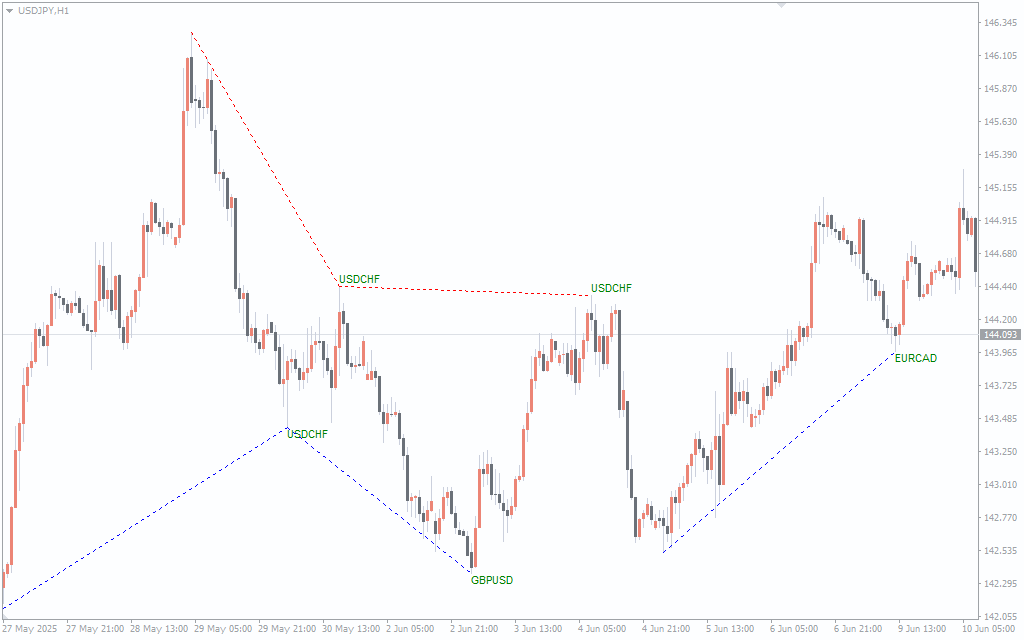 This indicator plots dotted lines between swing points of correlated or inverse pairs on the chart. When SMT divergence is detected, colored lines appear: red lines highlight bearish divergence when the direct symbols form lower highs while the inverse symbol fails to confirm, while blue lines signal bullish divergence where the direct pairs make higher lows and the inverse pair disagrees. These signals suggest potential turning points or moments when the market structure might break, allowing traders to refine entries or exits based on divergence logic.