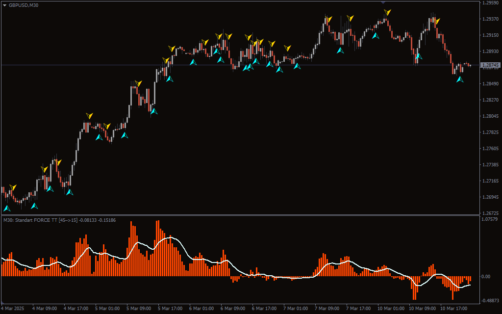 The Volume RV MTF Indicator generates buy and sell signals based on the relative volume strength and force calculations. When a strong buy signal appears, the indicator places an aqua arrow, indicating an increase in buying pressure. Conversely, a strong sell signal is marked by a gold arrow, signifying rising selling pressure.
