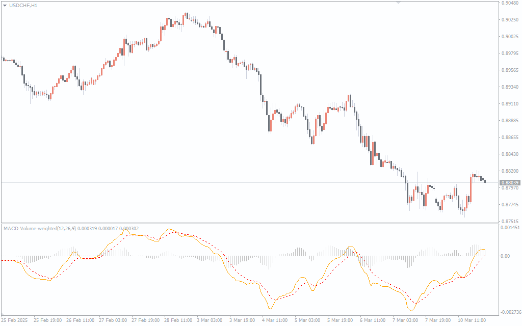 The Volume Weighted MACD generates signals based on the relationship between the MACD line, the signal line, and the histogram, much like the standard MACD. However, it adjusts the calculations by incorporating volume, making its signals more reliable. When the MACD line crosses above the signal line, it indicates a bullish trend, especially if supported by increasing volume. Conversely, a bearish trend is confirmed when the MACD line crosses below the signal line with high volume. Additionally, divergences between price action and the indicator can signal potential trend reversals.