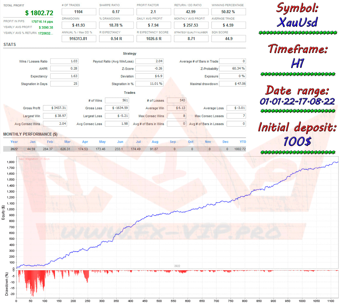 We conducted the second back test on the H1 timeframe also with a $100 deposit, but the settings have already been changed at our discretion, you can download this settings file from our telegram channel by clicking on the link https://t.me/FX_VIP/1864 , why we changed the settings and the timeframe, I will tell you below in the post. Well, now you can get acquainted with the results of the back test in more detail.