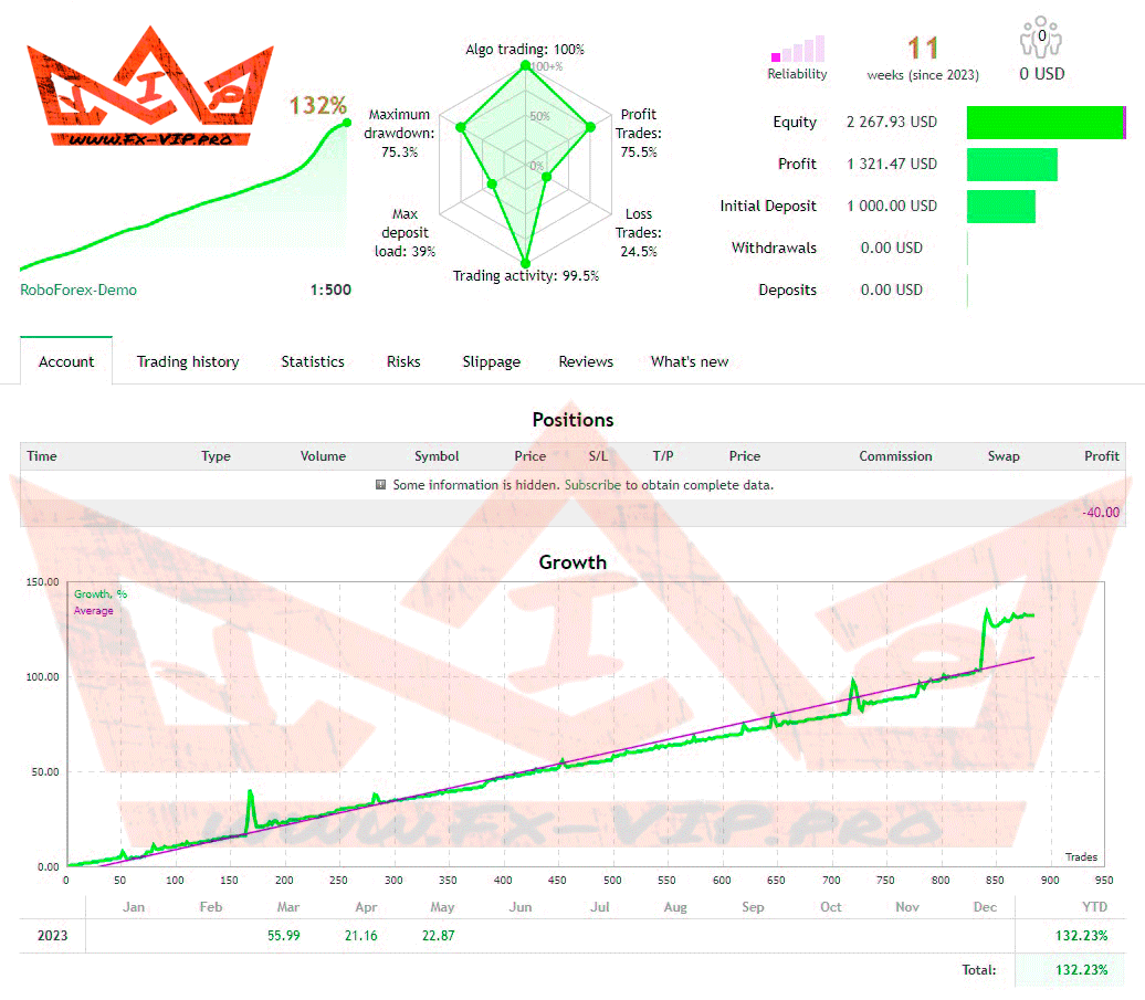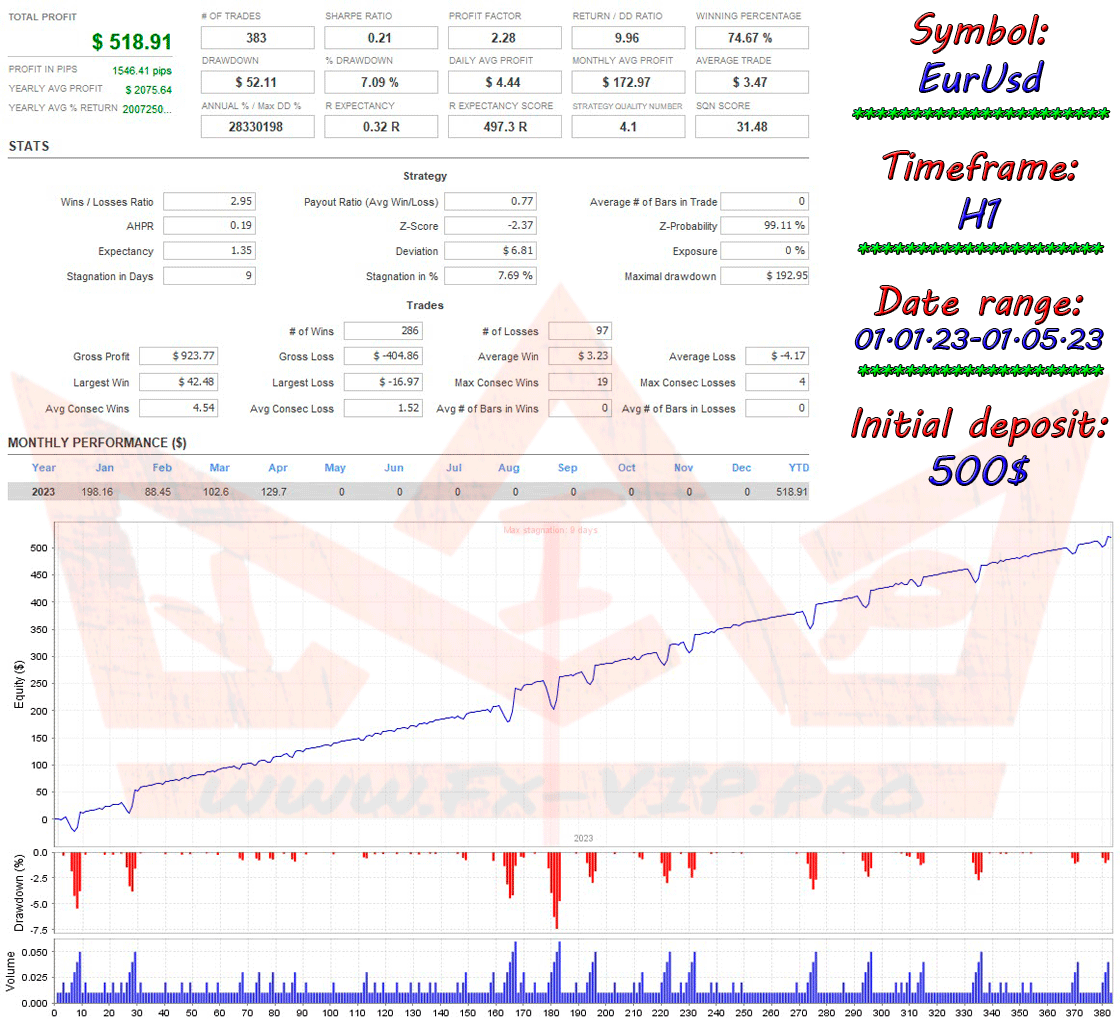 Backtesting was carried out for the EURUSD currency pair with default settings, but there is also live trading monitoring with all currency pairs, you can find out more about everything below.