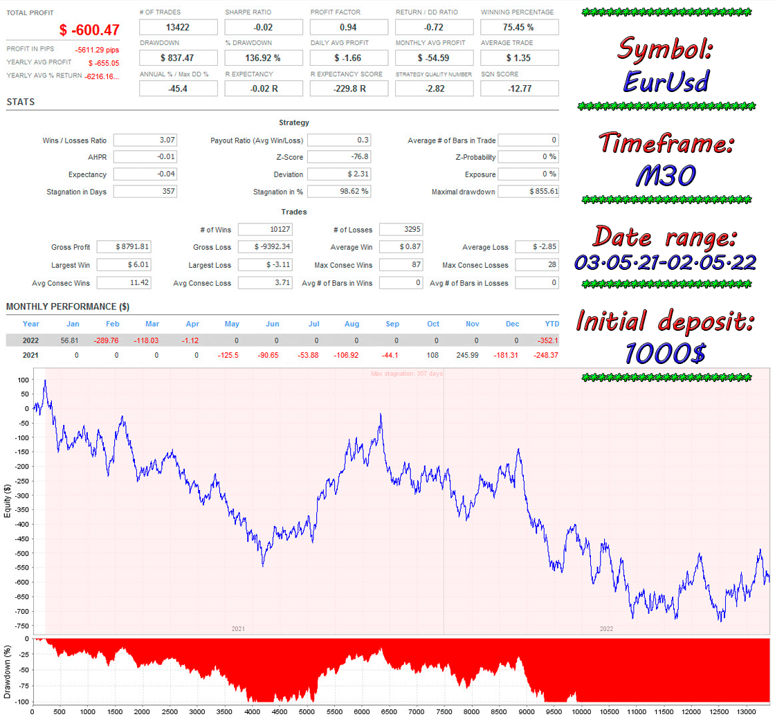 Although different timeframes can be used for this EA, I briefly tested each one and I think that the most suitable timeframe is M30, on which the back tests presented below were carried out, I want to note that all settings were used by default except for setting the MaximumOrders, in the first two tests I set the value “1” in the last left the default “10”