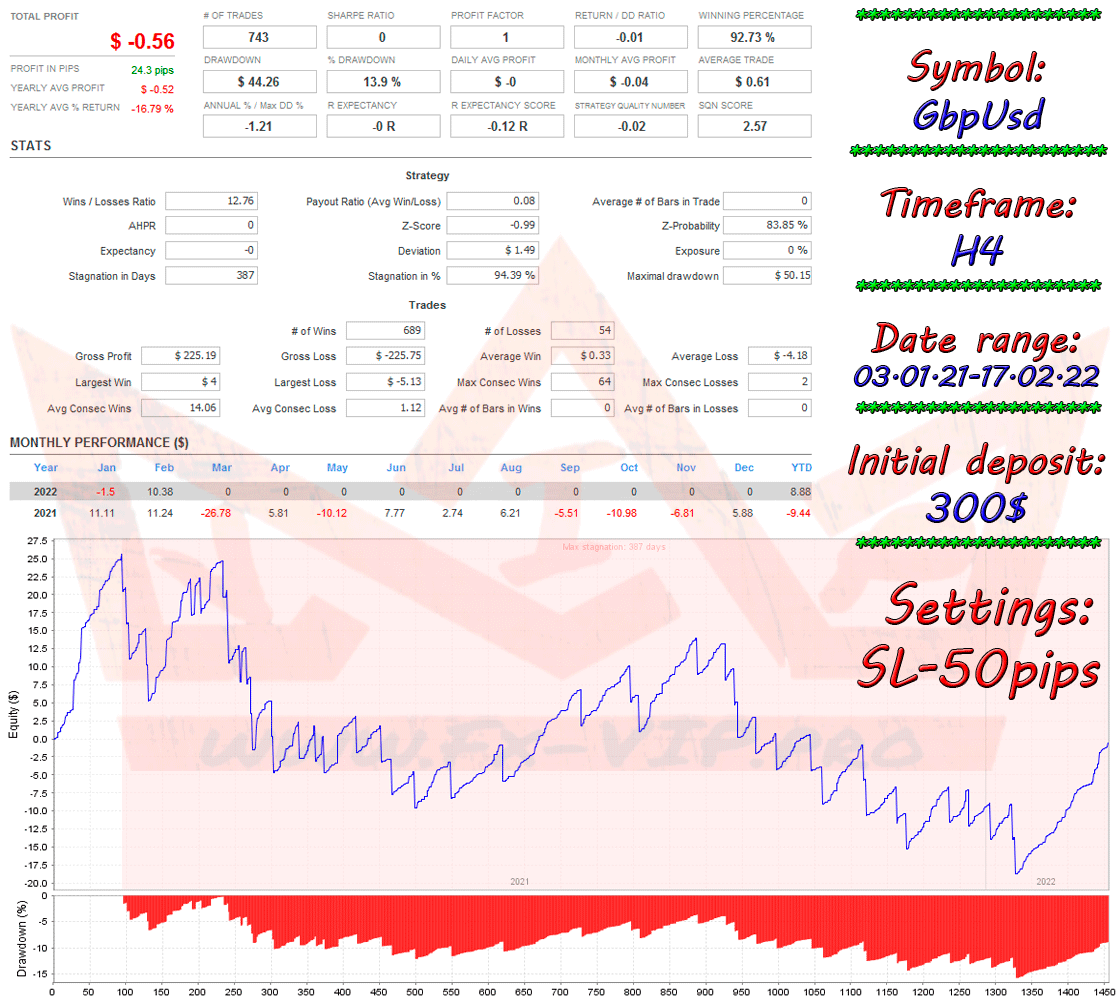 So we have Pip Breaker. Having tested it with SL 50 points, we came to the conclusion that it trades at zero, the maximum drawdown was about 15% and the initial deposit was $300. Based on such a drawdown, we conclude that we can reduce the deposit to $150, in which case we will have a maximum drawdown of 30%, which is generally acceptable.