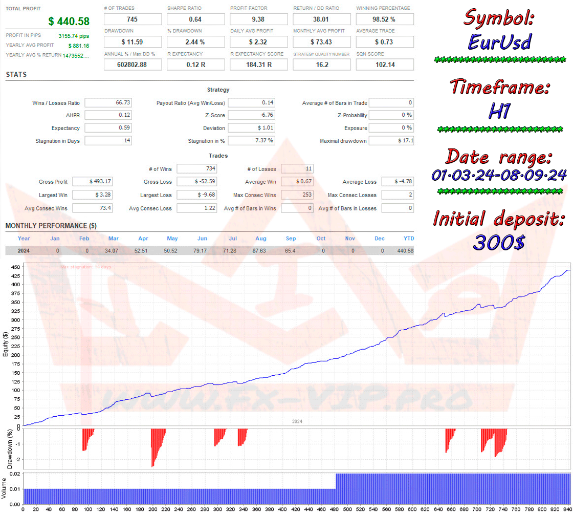 I have conducted two tests on history and this adviser shows good results, the first test was done with the recommended deposit size of 1000 units, the results showed that you can try to reduce the deposit to 300 and adjust the lot size in the settings to 0.01 and the robot also shows good results with a relatively small maximum drawdown. Below I will publish the results of testing with a deposit of 300, you can see more about it.