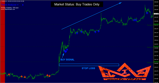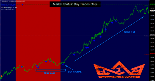 A buy signal appears when the window is blue and an arrow of the same color appears on the chart.