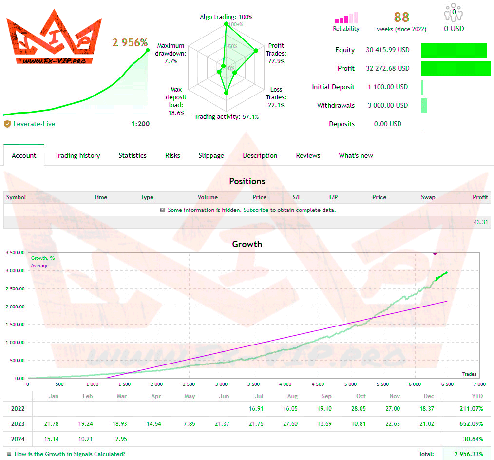 Firstly, I really hope that this EA is really profitable and it’s worth checking, but first, only on a demo account, since it does not inspire confidence in me at all, since this advisor is based on the averaging trading method, this is a grid of orders without SL and TP, and this It’s already unpleasant to say the least, in addition to this description of the advisor, the developer writes a lot of all sorts of beautiful phrases and talks about winning places in some competitions, well, he’s literally the best advisor in the world, but in fact he doesn’t say anything about the advisor, what strategy he uses, and in In general, what is the logic of trading, is not clear , it seems to me that the author is simply choosing beautiful expressions to sell his miracle advisor, but in fact there is nothing good in it and everyone who bought it will most likely be disappointed. Also, the icing on the cake is the account monitoring, which has earned 2,956% profit so far! It would seem that everything is very believable and cool, but this is only at first glance and I think only beginners in trading will believe it, because if we go deeper and see that monitoring is carried out by the broker “Leverate”, then everything immediately becomes clear, this is not a well-known broker of his no one knows there are few reviews about it that say that it is a fake company that can easily fake monitoring results, and all you see is this beautiful profit growth curve is just a scam.