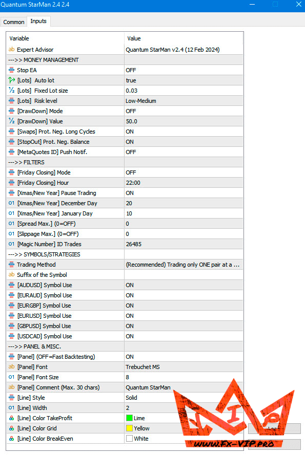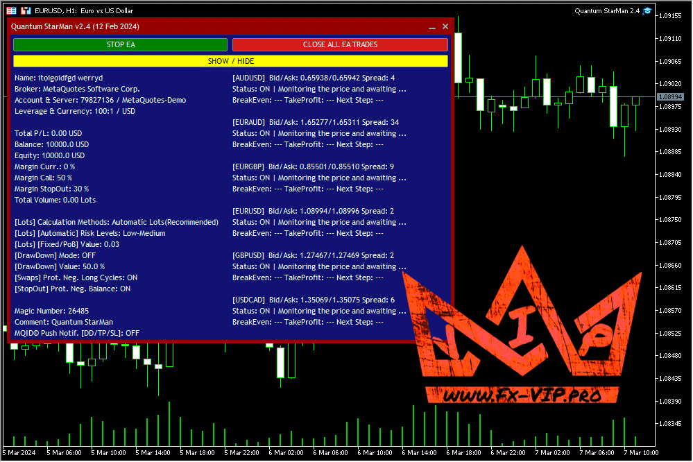 QuantStarMan EA is multi-currency all you need to do is attach it to one chart (EURUSD) and it will trade all currencies for you. Does not use Martingale strategies. Instead, it uses a complex mesh designed for maximum performance. And for your peace of mind, it is possible to close all transactions if the total drawdown on the account reaches a predetermined limit.