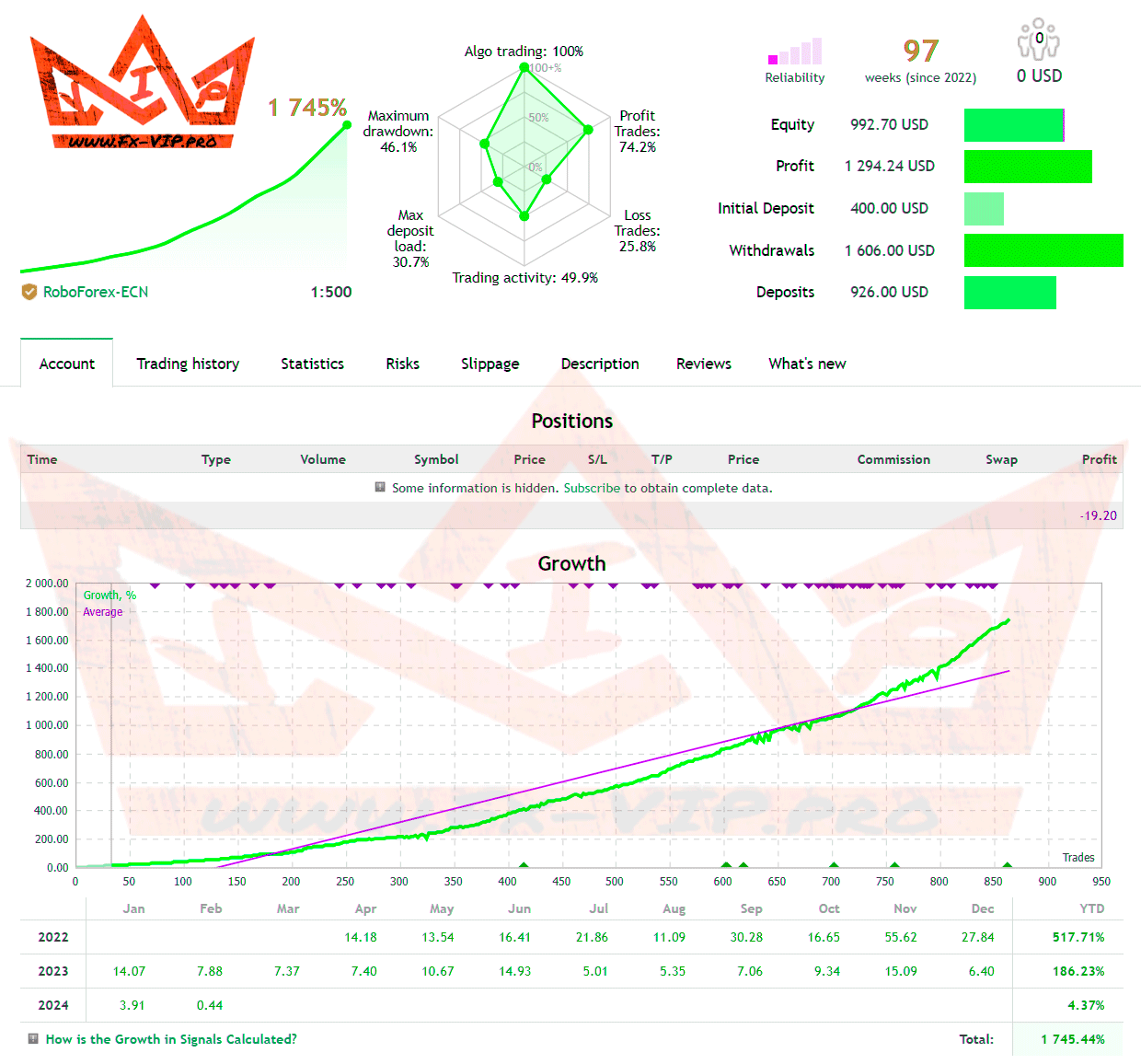 Backtesting was not carried out as there are account signal from the author, detailed statistics of trade can be found below