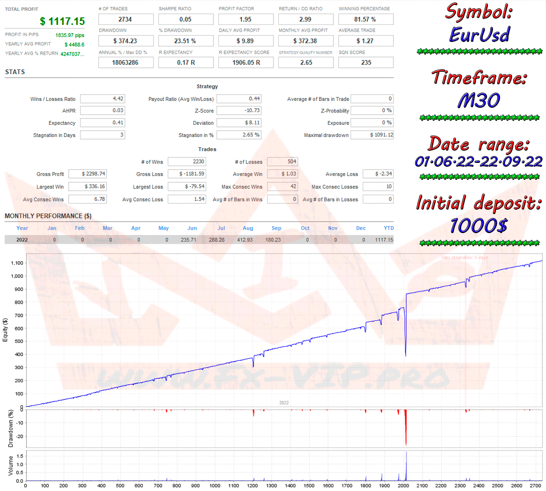 The test on the past history was carried out on the EURUSD currency pair with two options for set files on the M30 timeframe, the first option that you can see below is a back test with a settings file provided by the developer, this file is in the archive with the adviser, the next backtest is with our settings file it is more secure and suitable for small deposits from $100, you can download it by clicking on the link in our telegram channel https://t.me/FX_VIP/1884