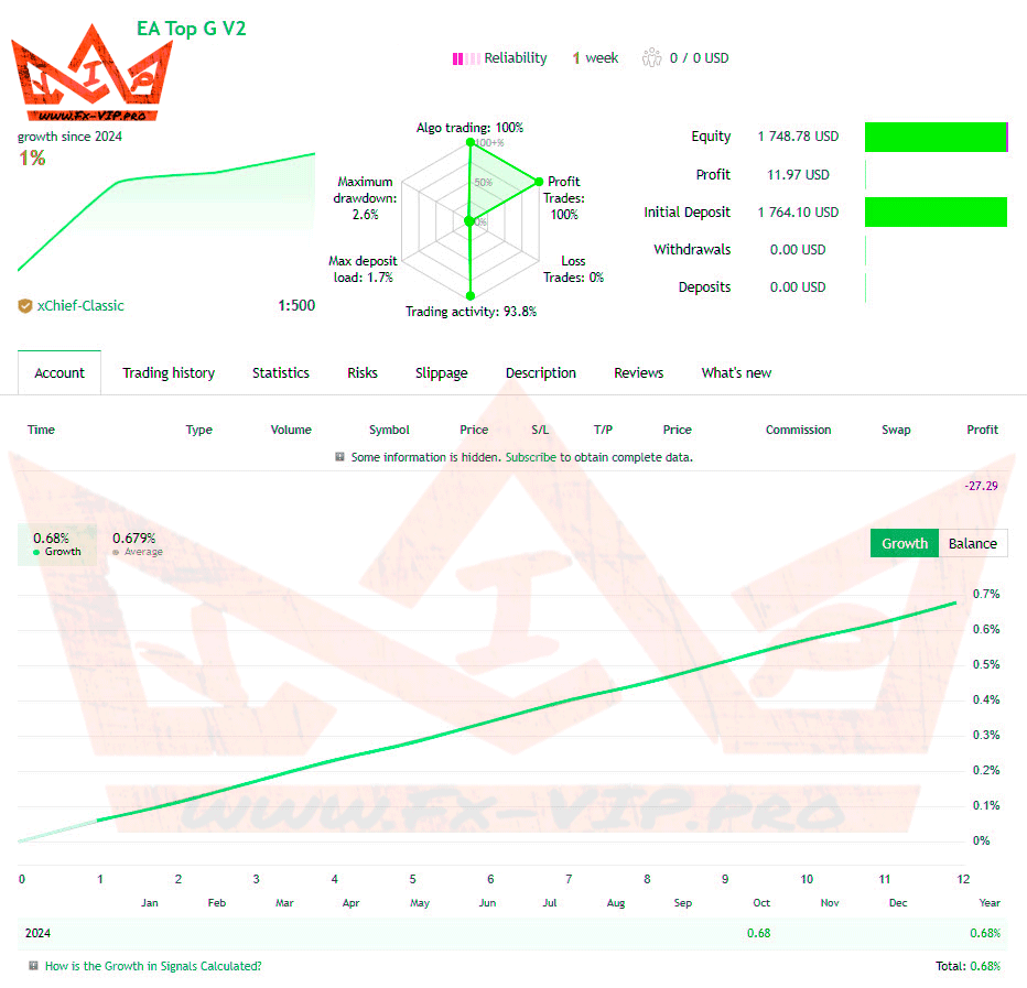The EA can be backtested, but the results will be inaccurate. The EA’s basic strategy is to scan each forex pair and avoid trading those that have not been profitable for a long period of time. When the market becomes favorable again, it will re-include these pairs. This feature cannot be backtested. But there is account monitoring from the author, although it was created quite recently, nevertheless I will publish it below so that you can watch it