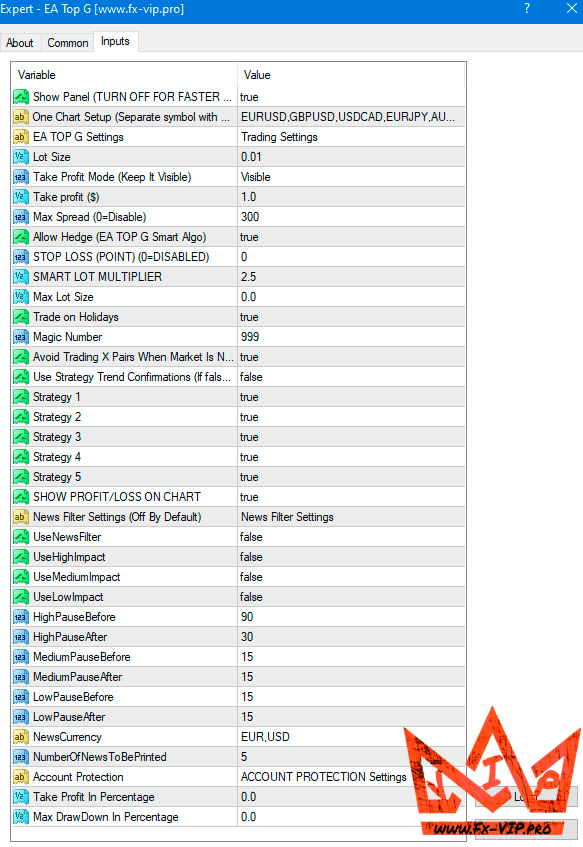 – Allow Hedge (EA TOP G Smart Algo) // By default, it’s set to true and must never be changed to false. Hedge means that the EA can open 1 buy and 1 sell order of the same forex pair.